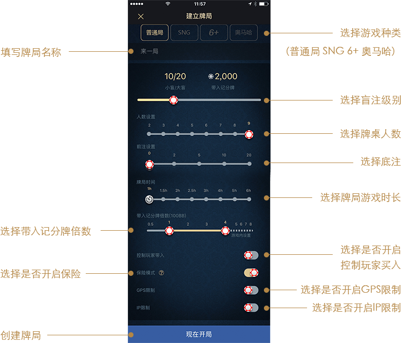 开启控制玩家买入后,玩家在牌桌上买入/补充筹瑪时,系统为房主发送消息,经房主确定玩家的请求后,玩家买入/补充筹瑪才会生效。若不开启控制玩家买入,则玩家在上桌时可自由买入/补充筹瑪。